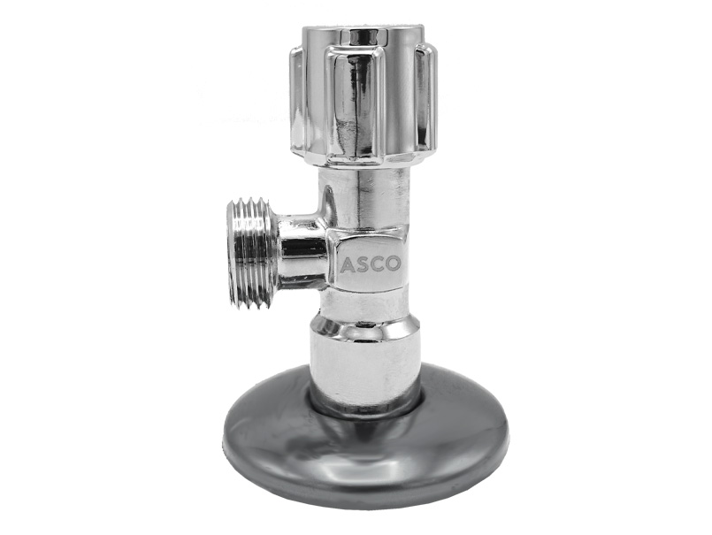 Кран латунний кутовий вентильний. Дозволяє не лише перекривати потік води, а й регулювати. Кутові приладові крани торгової марки ASCO призначені для підключення сантехнічних приладів, в тому числі пральних та посудомийних машин, унітазів, бойлерів. Матеріал кранів – високоякісна латунь. Покриття – хром. Поставляються в картонній упаковці в комплекті з декором (декоративна чашка) круглої форми. Розміри 1/2"х1/2" і 1/2"х3/4".