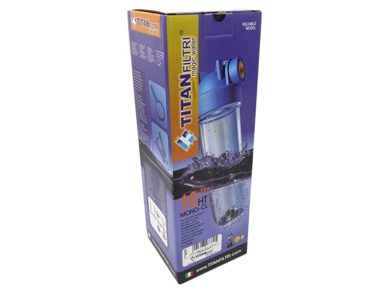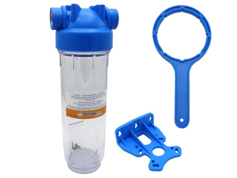 Пластикова непрозора колба прозорого кольору для магістрального фільтра. Клас продукції стандарт. Матеріал різьб - латунь. Верхівка колби синього кольору. Варіанти діаметрів: 1/2, 3/4 і 1 дюйм. На кожній колбі нанесено маркування. Робочий тиск 10 бар. Температура води: до 40 градусів