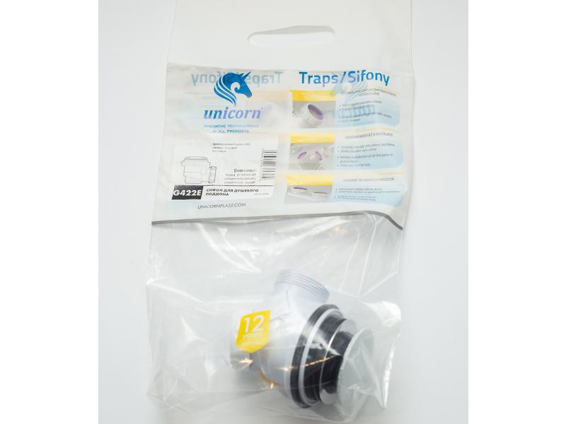 Сифон для душової кабіни Ø65 UNICORN з EASYOPEN без відводу G422E. Важлива особливість такої моделі полягає в тому, що гумові ущільнювачі контрастного синього кольору вже інтегровані в корпус сифона завдяки використанню багатокомпонентного лиття (технологія Multi-Injection). Це значно прискорює його монтаж і мінімізує ймовірність протікань. Сифон часто наражається на небезпеку з боку механічних пошкоджень під час експлуатації. Щоб максимально мінімізувати такі ризики, в моделі реалізовано практику Increased Strength (підвищена міцність), спрямовану на виготовлення ущільнювачів з термоеластопласту, що забезпечує додаткову щільність і міцність, а також використовується високоміцний пластик, з якого зроблений корпус. Схема та інструкція з монтажу зображена на упаковці, а чашка сифона поставляється в зібраному вигляді, що полегшує і пришвидшує монтаж сифона. Гарантія – 12 років.