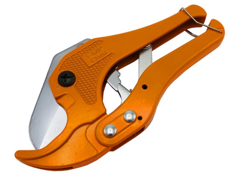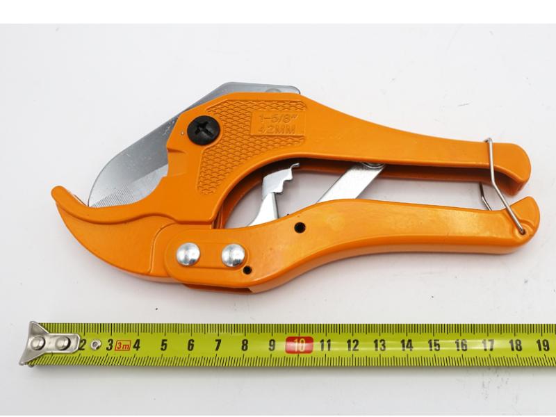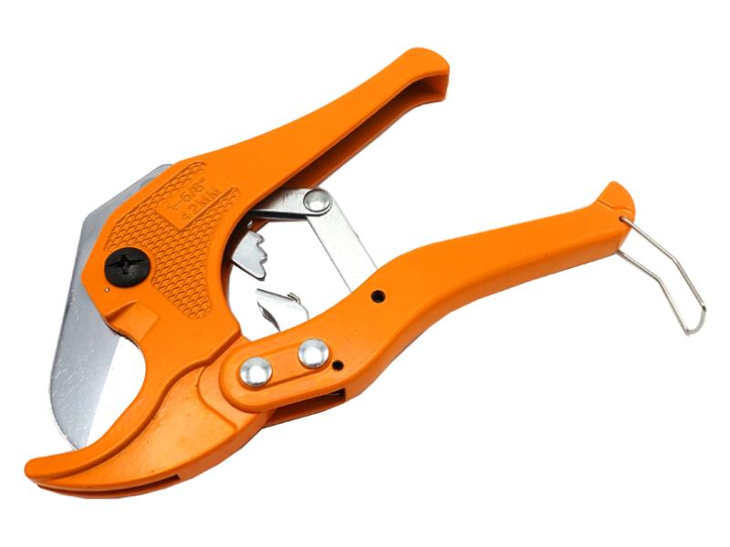 Ножиці для пластикових труб до 42 мм в діаметрі. Ножиці призначені для ручного розрізання під прямим кутом металополімерних та пластикових труб із зовнішнім діаметром до 42 мм включно. Під час різання гнучкої труби з ПВХ слід обертати трубу під час стискання. Сумісність: підходить для труб діаметром до 42 мм. Перевірка: До початку роботи різаком необхідно переконатися, що ніж заходить точно по центру паза верхніх губок. Перекіс свідчить або про слабку затяжку болтів або про слабку затяжку гвинта осі. Усі болти слід підтягнути. ВАЖЛИВО! Після роботи з трубами необхідно очистити лезо мастилом. Без цього лезо може прийти в несправність. Після 300 циклів порізу необхідне заточування лез. УВАГА! Коли цей продукт використовується взимку, трубу спочатку поміщають у теплу воду для нагрівання для кращого різання. Не використовувати для перерізу електрокабелів.