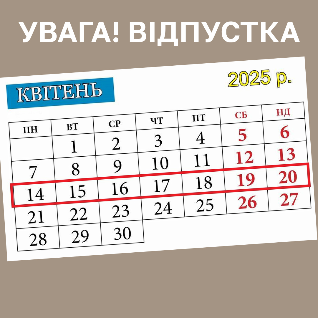 Ми працюємо до 11.04.2025 р. включно і потім йдемо на тиждень відпочивати на роботу виходимо 21.04.2025 р.