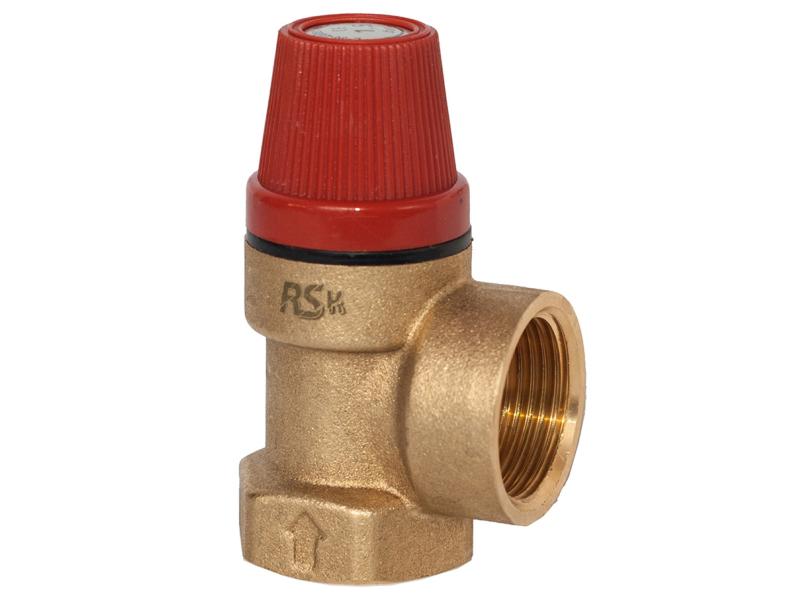 Запобіжний клапан від торгової марки RSk Італія. Основне призначення клапана - захист водонагрівального обладнання і системи опалення від загрози, пов'язаної з надлишковим тиском. Клапан здійснює скидання рідини в автоматичному режимі - завдяки цьому тиск в обладнанні приходить в норму. Робота системи стабілізується. Рекомендовано встановлювати клапан при користуванні бойлерами в багатоквартирному будинку. При виборі клапана варто звертати увагу на латунь і держак. Гарним варіантом є клапани з різьбленням ½ "і ¾", а також моделі для підключення манометра. Діапазон тиску - в залежності від моделі - від 1,5 до 8 бар. Матеріали: корпус - латунь, мембрана - гума EPDM, шток - латунь, прокладка - нейлон, кільце ущільнювача - червоне вулканізоване волокно, нижній штепсель - нейлон, пружина - сталь, пружинний затвор - латунь, держак - нейлон, шайба - сталь, гайка - сталь, покажчик дисковий - алюміній, штепсель - нейлон.