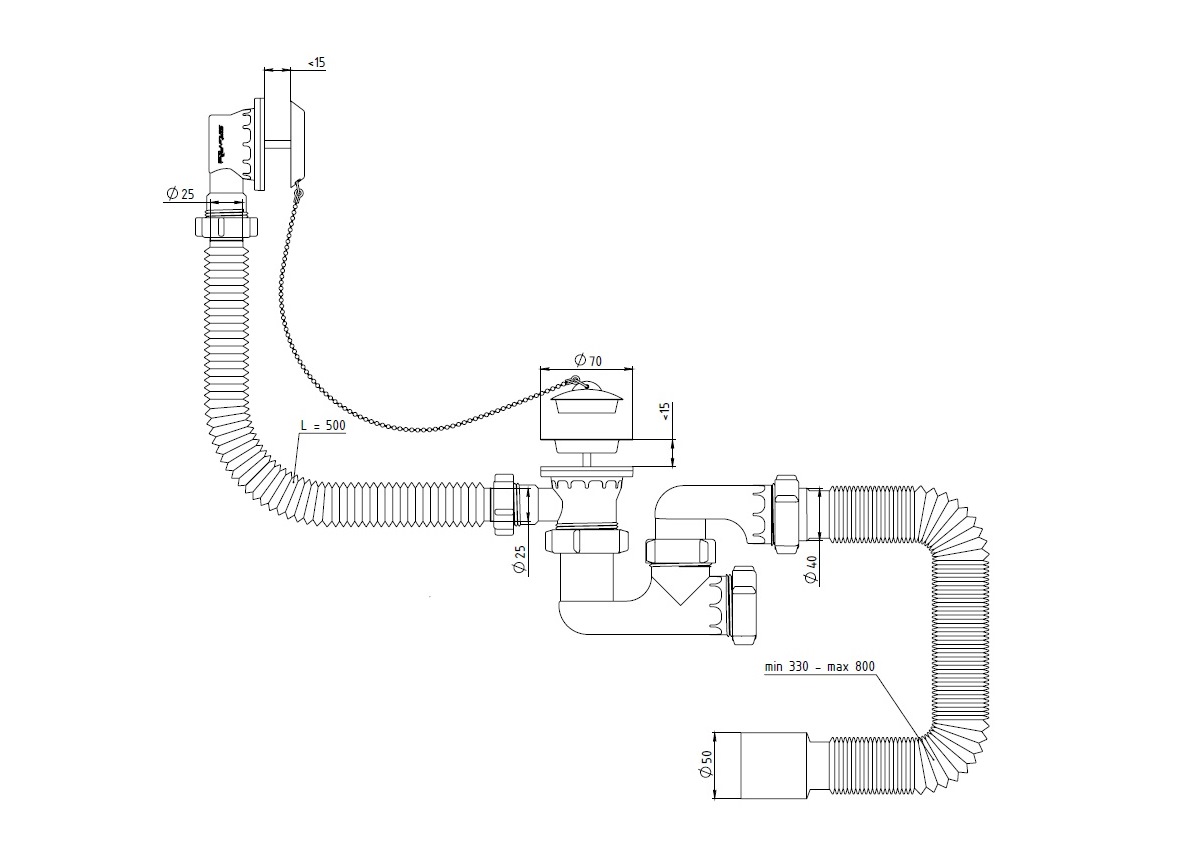 Сифон-автомат для ванни нерж. випуск 1 1/2" з перелив. і гнучкою труб. Flat Steamer SVD-05 1/15