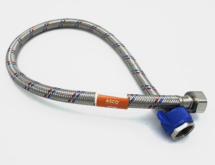 Шланги виробляються з нетоксичної гуми (EPDM) і мають обплетення з нержавіючого сталевого дроту. Кінці шлангів забезпечені сполучними фітингами з розмірами латунних штуцерів і накидних гайок. Надійність шланга і підводки забезпечується ще й тим, що всі сполучні деталі виконані з нержавіючої сталі AISI 304, а латунні гайки мають достатню висоту і товщину стінок. Продукція сертифікована в Україні і розроблена спеціально для використання в системах водопостачання і опалювання нашої країни. Підходять для гарячої та холодної води. Основні характеристики: • Довжина: 0,5 м • Радіус вигину: 30 мм • Робочий тиск: 10 bar • Розмір різьблення, дюйм 1/2 "х 1/2" • Тип підключення: ВВ • Температура: - 5 + 90 ° С • Пропускна здатність при тиску 3 bar: 32 л / хв • Внутрішній діаметр: 8,5 мм; • Зовнішній діаметр: 12,5 мм • Застосування: для монтажу сантехнічних вузлів і водопровідного обладнання Шланги ASCO Armatura - легкі в застосуванні і надійні, послужать вам довгі роки