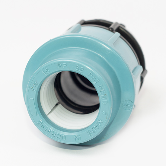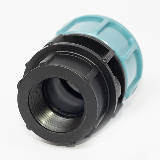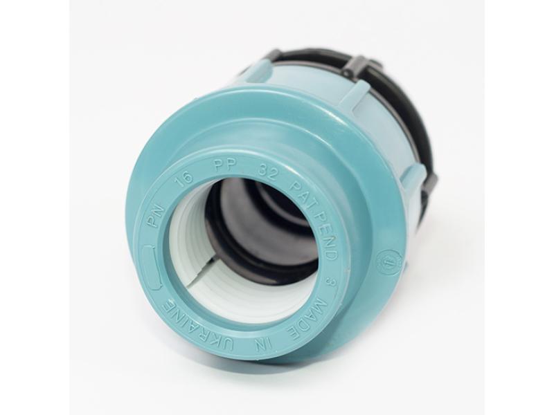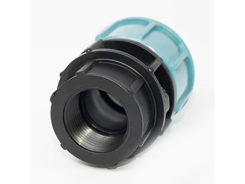 Муфта для поліетиленових труб внутрішня різьба 1", діаметр Ø32. Компресійні фітинги застосовуються для створення зовнішніх водопроводів, поливних систем і використовуються переважно для транспортування холодної води. Переваги: доступність за ціною, невелика вага, швидкий і легкий монтаж, що не вимагає додаткових інструментів, можливість створення роз'ємних з'єднань. Номінальна температура для застосування – 20˚С, а максимальна робоча температура – до 60˚С в межах робочого діапазону труб. Номінальний тиск залежить від діаметра: для 16, 20, 25, 32, 40, 50, 63 мм він складає 16 бар, для фітингів 75, 90 і 110 – 12,5 бар відповідно. Компресійні фітинги виробляються за стандартами UNI, ISO, DIN, NF, різьба за стандартами UNI, а фланцеві з'єднання відповідають вимогам UNI і DIN. Всі фітинги виконані за загальними технічними умовами. Для виготовлення фітингів використовується: чорний поліпропілен для корпусу, чорна прокладка з нітрилової гуми, біле затискне кільце з поліацетата і гайка з поліпропілену.