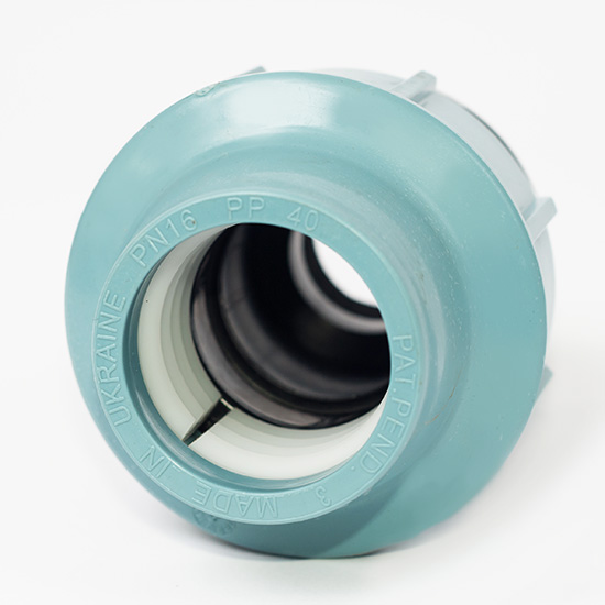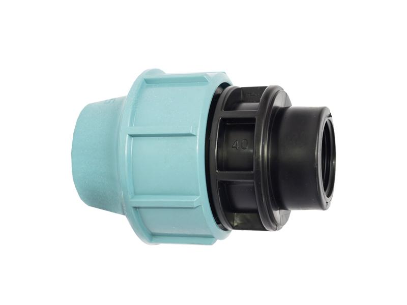 Муфта для поліетиленових труб внутрішня різьба 1", діаметр Ø40. Компресійні фітинги застосовуються для створення зовнішніх водопроводів, поливних систем і використовуються переважно для транспортування холодної води. Переваги: доступність за ціною, невелика вага, швидкий і легкий монтаж, що не вимагає додаткових інструментів, можливість створення роз'ємних з'єднань. Номінальна температура для застосування – 20˚С, а максимальна робоча температура – до 60˚С в межах робочого діапазону труб. Номінальний тиск залежить від діаметра: для 16, 20, 25, 32, 40, 50, 63 мм він складає 16 бар, для фітингів 75, 90 і 110 – 12,5 бар відповідно. Компресійні фітинги виробляються за стандартами UNI, ISO, DIN, NF, різьба за стандартами UNI, а фланцеві з'єднання відповідають вимогам UNI і DIN. Всі фітинги виконані за загальними технічними умовами. Для виготовлення фітингів використовується: чорний поліпропілен для корпусу, чорна прокладка з нітрилової гуми, біле затискне кільце з поліацетата і гайка з поліпропілену.
