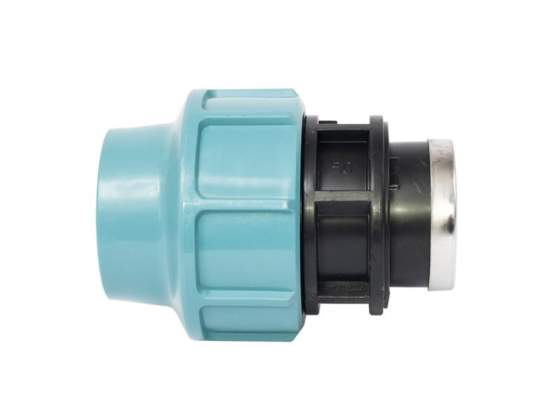 Муфта для поліетиленових труб внутрішня різьба 1 1/4", діаметр Ø50. Компресійні фітинги застосовуються для створення зовнішніх водопроводів, поливних систем і використовуються переважно для транспортування холодної води. Переваги: доступність за ціною, невелика вага, швидкий і легкий монтаж, що не вимагає додаткових інструментів, можливість створення роз'ємних з'єднань. Номінальна температура для застосування 20˚С, а максимальна робоча температура - до 60˚С в межах робочого діапазону труб. Номінальний тиск залежить від діаметра: для 16, 20, 25, 32, 40, 50, 63 мм воно складає 16 бар, для фітингів 75, 90 і 110 - 12,5 бар відповідно. Компресійні фітинги виробляються відповідно до стандартів UNI, ISO, DIN, NF, різьба відповідно до UNI, а фланцеві з'єднання відповідають вимогам UNI і DIN. Всі фітинги виконані відповідно до загальних технічних умов. Для виготовлення фітингів використовується чорний поліпропілен для корпусу, чорна прокладка з нітрилової гуми, біле затискне кільце з поліацетата і гайка з поліпропілену.