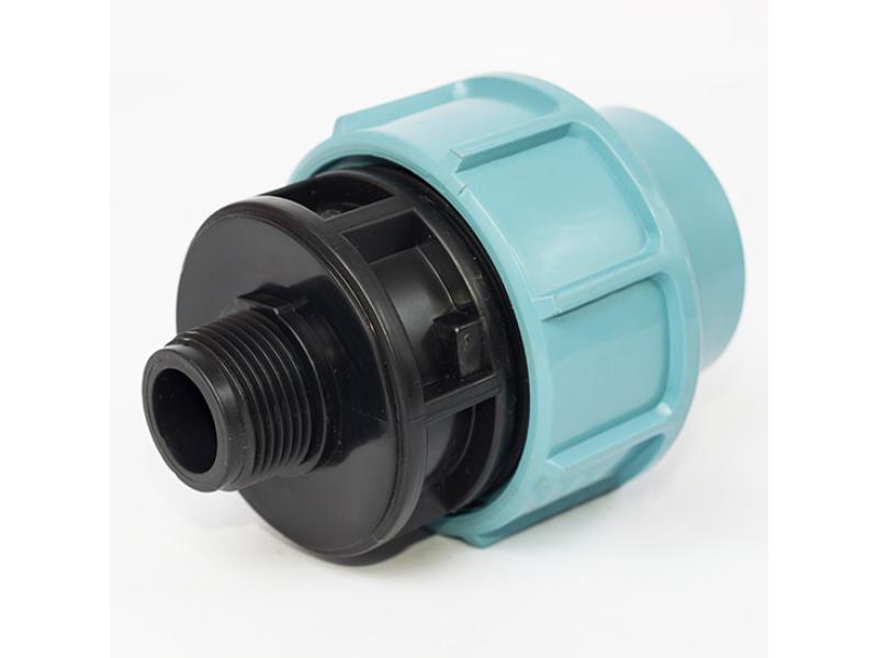 Муфта затискна для поліетиленових труб, зовнішня різьба 1", діаметр 50 мм. Компресійні фітинги застосовуються для створення зовнішніх водопроводів, поливних систем і використовуються переважно для транспортування холодної води. Переваги: доступність за ціною, невелика вага, швидкий і легкий монтаж, що не вимагає додаткових інструментів, можливість створення роз'ємних з'єднань. Номінальна температура для застосування 20˚С, а максимальна робоча температура - до 60˚С в межах робочого діапазону труб. Номінальний тиск залежить від діаметра: для 16, 20, 25, 32, 40, 50, 63 мм воно складає 16 бар, для фітингів 75, 90 і 110 - 12,5 бар відповідно. Компресійні фітинги виробляються відповідно до стандартів UNI, ISO, DIN, NF, різьба відповідно до UNI, а фланцеві з'єднання відповідають вимогам UNI і DIN. Всі фітинги виконані відповідно до загальних технічних умов. Для виготовлення фітингів використовується чорний поліпропілен для корпусу, чорна прокладка з нітрилової гуми, біле затискне кільце з поліацетата і гайка з поліпропілену.