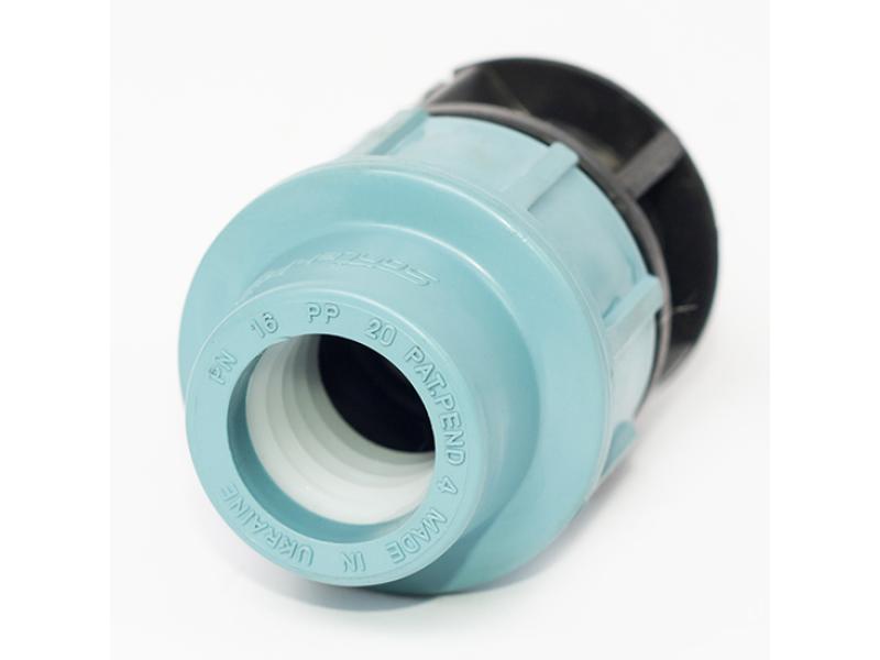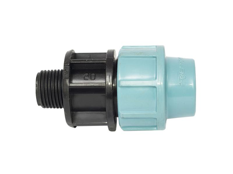 Муфта затискна для поліетиленових труб, зовнішня різьба 1/2", діаметр 20 мм. Компресійні фітинги застосовуються для створення зовнішніх водопроводів, поливних систем і використовуються переважно для транспортування холодної води. Переваги: доступність за ціною, невелика вага, швидкий і легкий монтаж, що не вимагає додаткових інструментів, можливість створення роз'ємних з'єднань. Номінальна температура для застосування 20˚С, а максимальна робоча температура - до 60˚С в межах робочого діапазону труб. Номінальний тиск залежить від діаметра: для 16, 20, 25, 32, 40, 50, 63 мм воно складає 16 бар, для фітингів 75, 90 і 110 - 12,5 бар відповідно. Компресійні фітинги виробляються відповідно до стандартів UNI, ISO, DIN, NF, різьба відповідно до UNI, а фланцеві з'єднання відповідають вимогам UNI і DIN. Всі фітинги виконані відповідно до загальних технічних умов. Для виготовлення фітингів використовується чорний поліпропілен для корпусу, чорна прокладка з нітрилової гуми, біле затискне кільце з поліацетата і гайка з поліпропілену.