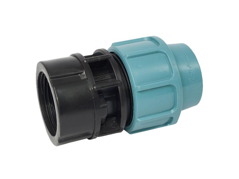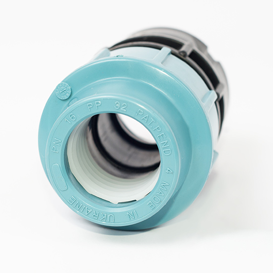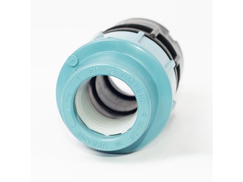 Муфта для поліетиленових труб внутрішня різьба 1 1/4", діаметр Ø32. Компресійні фітинги застосовуються для створення зовнішніх водопроводів, поливних систем і використовуються переважно для транспортування холодної води. Переваги: доступність за ціною, невелика вага, швидкий і легкий монтаж, що не вимагає додаткових інструментів, можливість створення роз'ємних з'єднань. Номінальна температура для застосування 20˚С, а максимальна робоча температура - до 60˚С в межах робочого діапазону труб. Номінальний тиск залежить від діаметра: для 16, 20, 25, 32, 40, 50, 63 мм воно складає 16 бар, для фітингів 75, 90 і 110 - 12,5 бар відповідно. Компресійні фітинги виробляються відповідно до стандартів UNI, ISO, DIN, NF, різьба відповідно до UNI, а фланцеві з'єднання відповідають вимогам UNI і DIN. Всі фітинги виконані відповідно до загальних технічних умов. Для виготовлення фітингів використовується чорний поліпропілен для корпусу, чорна прокладка з нітрилової гуми, біле затискне кільце з поліацетата і гайка з поліпропілену.