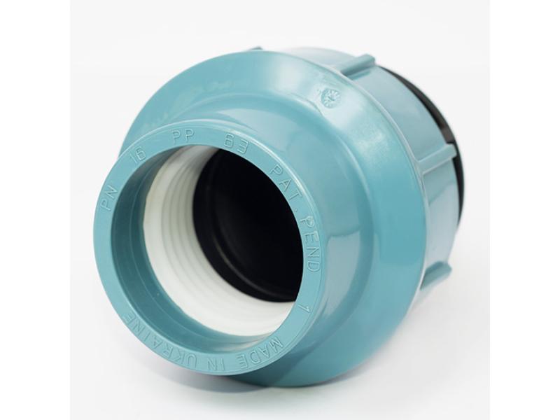 Муфта затискна для поліетиленових труб, зовнішня різьба 1 1/4", діаметр 63 мм. Компресійні фітинги застосовуються для створення зовнішніх водопроводів, поливних систем і використовуються переважно для транспортування холодної води. Переваги: доступність за ціною, невелика вага, швидкий і легкий монтаж, що не вимагає додаткових інструментів, можливість створення роз'ємних з'єднань. Номінальна температура для застосування – 20˚С, а максимальна робоча температура – до 60˚С в межах робочого діапазону труб. Номінальний тиск залежить від діаметра: для 16, 20, 25, 32, 40, 50, 63 мм він складає 16 бар, для фітингів 75, 90 і 110 – 12,5 бар відповідно. Компресійні фітинги виробляються за стандартами UNI, ISO, DIN, NF, різьба за стандартами UNI, а фланцеві з'єднання відповідають вимогам UNI і DIN. Всі фітинги виконані за загальними технічними умовами. Для виготовлення фітингів використовується: чорний поліпропілен для корпусу, чорна прокладка з нітрилової гуми, біле затискне кільце з поліацетата і гайка з поліпропілену.