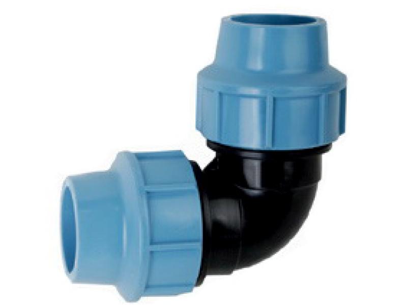 Коліно затискне для поліетиленових труб, діаметр Ø25. Компресійні фітинги застосовуються для створення зовнішніх водопроводів, поливних систем і використовуються переважно для транспортування холодної води. Переваги: доступність за ціною, невелика вага, швидкий і легкий монтаж, що не вимагає додаткових інструментів, можливість створення роз'ємних з'єднань. Номінальна температура для застосування – 20˚С, а максимальна робоча температура – до 60˚С в межах робочого діапазону труб. Номінальний тиск залежить від діаметра: для 16, 20, 25, 32, 40, 50, 63 мм він складає 16 бар, для фітингів 75, 90 і 110 – 12,5 бар відповідно. Компресійні фітинги виробляються за стандартами UNI, ISO, DIN, NF, різьба за стандартами UNI, а фланцеві з'єднання відповідають вимогам UNI і DIN. Всі фітинги виконані за загальними технічними умовами. Для виготовлення фітингів використовується: чорний поліпропілен для корпусу, чорна прокладка з нітрилової гуми, біле затискне кільце з поліацетата і гайка з поліпропілену.