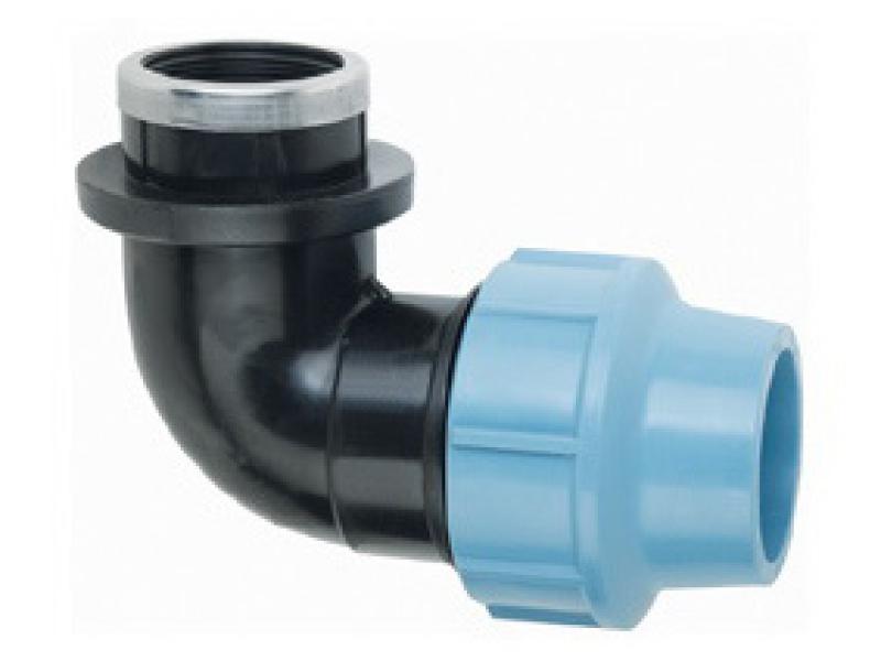 Коліно для поліетиленових труб, внутрішня різьба Ø40 х 3/4". Компресійні фітинги застосовуються для створення зовнішніх водопроводів, поливних систем і використовуються переважно для транспортування холодної води. Переваги: доступність за ціною, невелика вага, швидкий і легкий монтаж, що не вимагає додаткових інструментів, можливість створення роз'ємних з'єднань. Номінальна температура для застосування 20˚С, а максимальна робоча температура - до 60˚С в межах робочого діапазону труб. Номінальний тиск залежить від діаметра: для 16, 20, 25, 32, 40, 50, 63 мм воно складає 16 бар, для фітингів 75, 90 і 110 - 12,5 бар відповідно. Компресійні фітинги виробляються відповідно до стандартів UNI, ISO, DIN, NF, різьба відповідно до UNI, а фланцеві з'єднання відповідають вимогам UNI і DIN. Всі фітинги виконані відповідно до загальних технічних умов. Для виготовлення фітингів використовується чорний поліпропілен для корпусу, чорна прокладка з нітрилової гуми, біле затискне кільце з поліацетата і гайка з поліпропілену.
