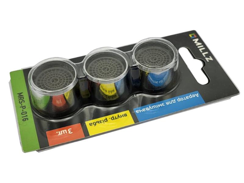 Продається блістером по 3 шт. Ціна зазначена ЗА БЛіСТЕР. Аератор - це допоміжний елемент, який встановлюється на край або всередину виливу, розділяє потік води на маленькі струйки і насичує їх бульбашками повітря. Завдяки цьому збільшується обсяг потоку і зменшується кількість бризок. Використання аератору дозволить економити до 40% води. Крім цього, використання аераторів надає наступні переваги: суміш води з повітрям має кращі миючі властивості; знижується рівень шуму від струменю води при використанні змішувача; водний потік стає м'якшим і набагато приємніше мити руки. Аератор MILLZ виготовлено в Китаї. Клас продукції: економ.