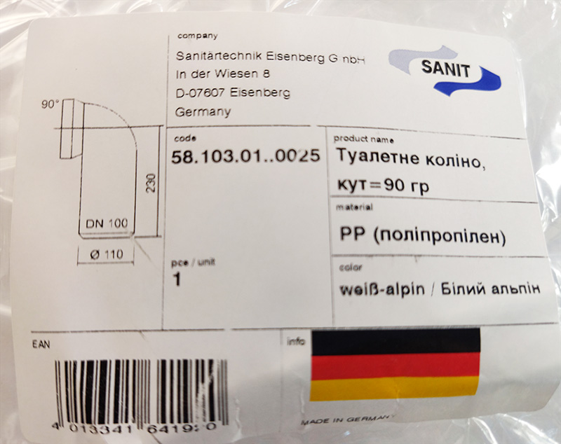 Коліно від бренду SANIT для підʼєднання унітаза до каналізаційного стоку з діаметром отвору для підʼєднання в 110 мм і кутом нахилу в 90°. Колір білий. Матеріал: пластик і гума. Надійна і перевірена модель. Відводи, гофри, патрубки до унітазів та бачків, пластикові трубки та інші пластмасові деталі Sanit виробляються з використанням технологічних процесів лиття під тиском та термопресуванням. Фанові труби (перехідники, сполучні елементи) Sanit - призначаються для з'єднання унітазу з каналізаційною трубою. Виготовляються з поліпропілену із спеціальним манжетним ущільнювачем. Для своїх виробів компанія використовує лише високоякісну сировину, що забезпечує надійність, порівняно з іншими сполучними елементами.