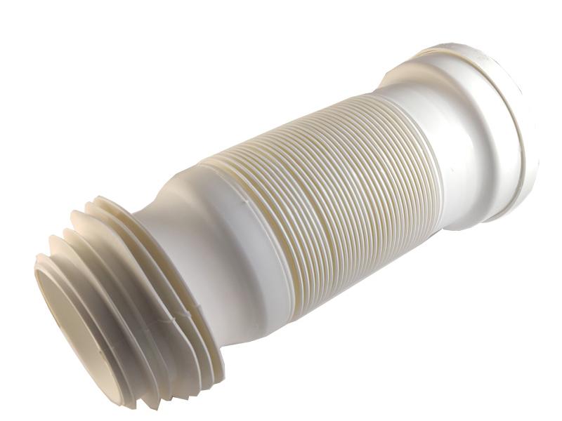 Біла гнучка гофра (манжет) для унітаза українського виробництва. Клас продукції - економ. За допомогою гофри можна підключити унітаз до каналізаційної мережі. Пряме призначення гофри - це відведення стічних вод від унітазу в каналізаційний стояк. В даний час гофри на унітаз виготовляють в основному з таких матеріалів, як пластик і гума. При покупці гофри необхідно звертати увагу на її відповідність необхідним параметрам - вона повинна підходити по довжині, типу ущільнення і діаметру посадочного отвору. Гофру на унітаз завдяки її конструктивними особливостями можна зігнути і витягнути на значну довжину, що дозволяє підібрати для унітазу вдале розташування в приміщенні. Гофра на унітаз замінить каналізаційну трубу, одним кінцем її можна легко поєднати з унітазом, а інший кінець гофри можна помістити в приймальний розтруб трійника або хрестовини. Необхідно простежити за тим, щоб при підключенні унітазу за допомогою гофри був дотриманий необхідний за нормативами нахил.