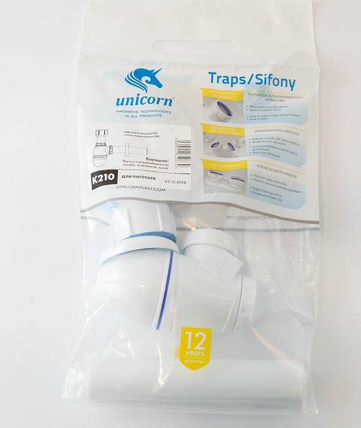Cифон для пісуара Ø40 з відводом Ø50 UNICORN K210. Важлива особливість такої моделі полягає в тому, що гумові ущільнювачі контрастного синього кольору вже інтегровані в корпус сифона завдяки використанню багатокомпонентного лиття (технологія Multi-Injection). Це значно прискорює його монтаж і мінімізує ймовірність протікань. Сифон часто наражається на небезпеку з боку механічних пошкоджень під час експлуатації. Щоб максимально мінімізувати такі ризики, в моделі реалізовано практику Increased Strength (підвищена міцність), спрямовану на виготовлення ущільнювачів з термоеластопласту, що забезпечує додаткову щільність і міцність, а також використовується високоміцний пластик, з якого зроблений корпус. Схема та інструкція з монтажу зображена на упаковці, а чашка сифона поставляється в зібраному вигляді, що полегшує і пришвидшує монтаж сифона. Гарантія – 12 років.