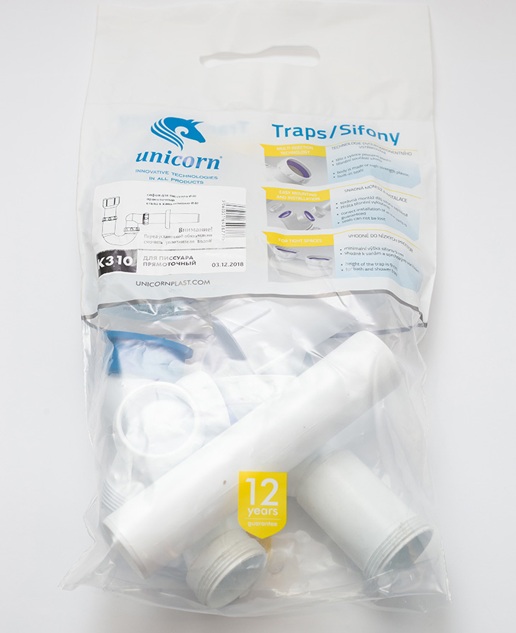 Cифон для пісуара Ø40 прямотічний з відводом Ø40 UNICORN K310. Важлива особливість такої моделі полягає в тому, що гумові ущільнювачі контрастного синього кольору вже інтегровані в корпус сифона завдяки використанню багатокомпонентного лиття (технологія Multi-Injection). Це значно прискорює його монтаж і мінімізує ймовірність протікань. Сифон часто наражається на небезпеку з боку механічних пошкоджень під час експлуатації. Щоб максимально мінімізувати такі ризики, в моделі реалізовано практику Increased Strength (підвищена міцність), спрямовану на виготовлення ущільнювачів з термоеластопласту, що забезпечує додаткову щільність і міцність, а також використовується високоміцний пластик, з якого зроблений корпус. Схема та інструкція з монтажу зображена на упаковці, а чашка сифона поставляється в зібраному вигляді, що полегшує і пришвидшує монтаж сифона. Гарантія – 12 років.