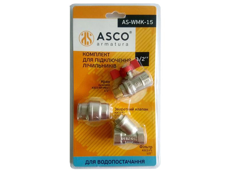 Набір для підключення лічильника для води AS-WMK-15 торгової марки ASCO - це комплексне рішення для монтажу водомірів. Що входить до складу комплекту: - кульовий кран для перекриття потоку води. арт крана NP-RB11 з різьбою 1/2"ЗВ. Матеріал – латунь, покриття – нікель, червоний метелик. Робочий тиск PN40, температура транспортованої рідини – до 150˚С. - фільтр грубого очищення (косий фільтр, грязьовик) який затримує забруднення, які можуть пошкодити лічильник чи побутову техніку. Фільтр має діаметр 1/2". Ступінь очищення - 400 мкм. Корпус – нікельована латунь. - зворотний клапан, що забезпечує рух води лише в заданому напрямку. Корпус із стійкої нікельованої латуні. Комплект для встановлення лічильника продається у прозорому блістері з підвісом, який забезпечує зручне кріплення на гачок в магазині. А покупцю - надає на задній стороні блістера усю додаткову інформацію.