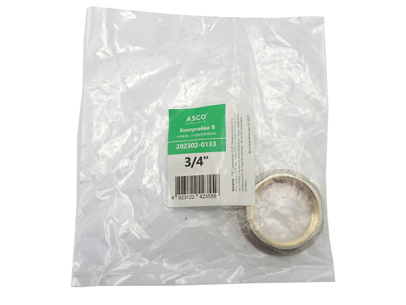 Латунна нікельована контргайка з проточкою ASCO з діаметром 3/4", різьба В застосовується для монтажу трубопровідних систем (водопровідних, господарсько-питних, опалювальних) для транспортування будь-яких середовищ, неагресивних до матеріалів виробу. ТЕХНІЧНІ ХАРАКТЕРИСТИКИ: тиск робочий 4,0 мПа (40 бар) (для розмірів від 1/2 "до 1"; 2,5 мПа (25 бар) (для розмірів від 1 1/4 "до 2"). Робоча температура: від -20 до +200 ° С (для виробів без ущільнення), від -20 до +120 ° С (для виробів з ущільненням EPDM). Матеріал корпусу: латунь CW617N (ЛС 59-2). Латунні різьбові фітинги ASCO мають ряд беззаперечних переваг, а саме: покриття нікель, що не боїться подряпин! Проточка різьб - показує якість латуні. А сама різьба точна і без задирок (не травмує пальці порізами). І це ще не все. Латунні різьбові фітинги від АСКО мають штрихкод - на коробках і на кожному окремому фітингу (кожна окрема штучка має підвіс із зазначенням артикула і штрихкод, на деяких фітингах замість бірки йде поліетиленовий пакетик з наклейкою, на якій також є артикул і штрихкод). Саме завдяки цьому різьбові перехідники ASCO легко приймати на складі і пересорти зведені до мінімуму