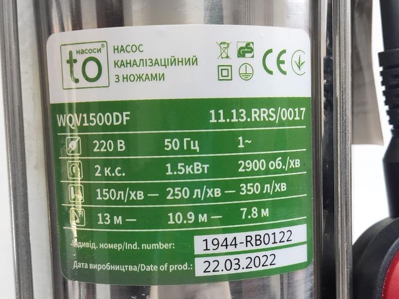 WQV1500DF 1.5кВт насос каналізаційний H15(10.5) Q417(250)л/хв з ножем поплавець кабель 10м toНасоси