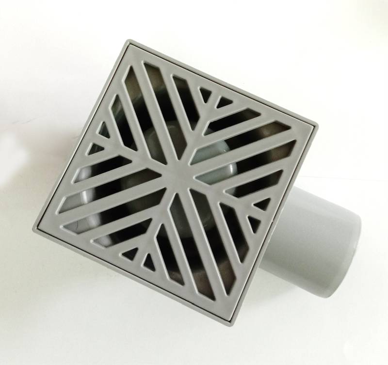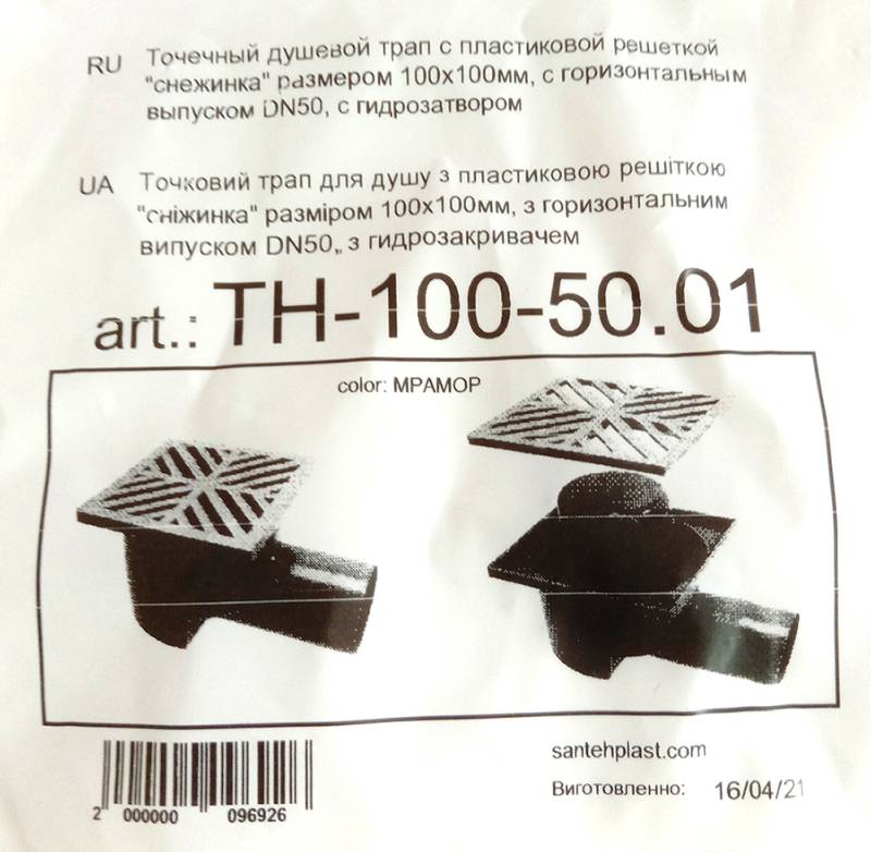 Горизонтальний пластиковий душовий трап торгової марки Santehplast (Сантехпласт) з гідрозатвором сірого кольору. Розмір решітки – 10х10 см. Узор решітки – сніжинка. Діаметр випуску – DN50. Виробництво – Харків, Україна.