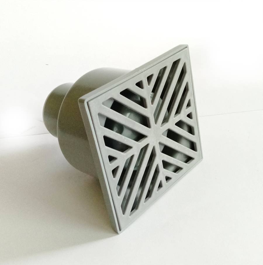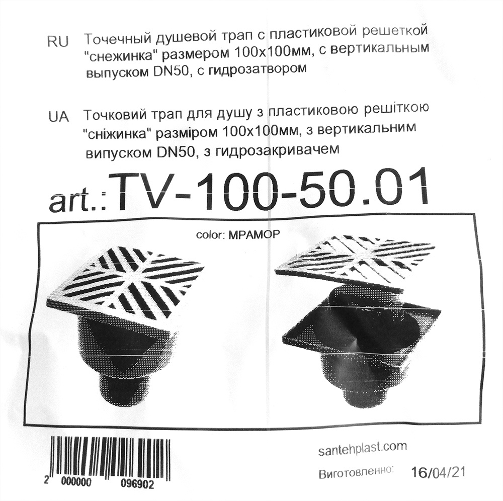 Вертикальний пластиковий душовий трап торгової марки Santehplast (Сантехпласт) з гідрозатвором сірого кольору. Розмір решітки – 10х10 см. Узор решітки – сніжинка. Діаметр випуску – DN50. Виробництво – Харків, Україна.