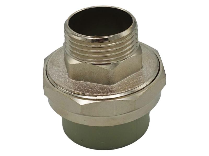 Сіре поліпропіленове розбірне з'єднання, американка, діаметр 25 мм x3/4", різьба зовнішня. Використовується для з'єднань різних, діаметрів труб або інших деталей, де зовнішній отвір може бути з'єднаний з внутрішньою різьбою інших елементів. Розбірна американка ППР з зовнішньою різьбою дозволяє забезпечити стійке сполучення елементів системи без необхідності використання додаткових герметиків або клею. Лінійка продукції ASCO PPR є кращою за асортиментом поліпропіленових труб і фітингів на ринку. Продукція поставляється в білому і сірому кольорі і представляє широкий діапазон з'єднувальних елементів і гідравлічної арматури: від 20 до 110 мм. В цілому асортимент бренду ASCO PPR включає понад 1000 товарних позицій. У конструкції фітингів ASCO PPR закладено кілька принципових рішень, що підвищують надійність і зручність застосування. Латунні елементи комбінованих фітингів мають зворотні проточки, що забезпечують надійніше приєднання латунної і поліпропіленової частин. Герметичність з'єднання зберігається навіть при підвищених механічних навантаженнях. Спеціальні мітки на поверхні фітингів спрощують процес монтажу. Продукція повністю відповідає нормам українського законодавства, проходить контроль якості на всіх етапах виробництва, де використовується високоякісна сировина з Німеччини та Південної Кореї.