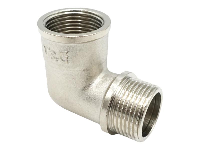 Латунні різьбові фітинги V & G (нікельовані, хромовані) застосовуються для монтажу трубопровідних систем (водопровідних, господарсько-питних, опалювальних) для транспортування будь-яких середовищ, неагресивних до матеріалів виробу. ТЕХНІЧНІ ХАРАКТЕРИСТИКИ: тиск робочий 2,5 мПа (25 бар) (для розмірів від 1/2 "до 1", крім VG-204301, VG-204302); 1,6 мПа (16 бар) (для розмірів від 1 1/4 "до 2"). Робоча температура: від -20 до +200 ° С (для виробів без ущільнення), від -20 до +130 ° С (для виробів з ущільненням EPDM). Матеріал корпусу: латунь CW617N (ЛС 59-2). Кутник три чверті дюйма нікельований внутрішньо-зовнішня різьба застосовується там, де необхідно створити поворот у трубопроводі під певним кутом. Інші назви цього фітинга: коліно різьбове, кут латунний.