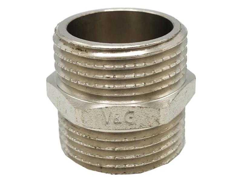 Латунні різьбові фітинги V & G (нікельовані, хромовані) застосовуються для монтажу трубопровідних систем (водопровідних, господарсько-питних, опалювальних) для транспортування будь-яких середовищ, неагресивних до матеріалів виробу. ТЕХНІЧНІ ХАРАКТЕРИСТИКИ: тиск робочий 2,5 мПа (25 бар) (для розмірів від 1/2 "до 1", крім VG-204301, VG-204302); 1,6 мПа (16 бар) (для розмірів від 1 1/4 "до 2"). Робоча температура: від -20 до +200 ° С (для виробів без ущільнення), від -20 до +130 ° С (для виробів з ущільненням EPDM). Матеріал корпусу: латунь CW617N (ЛС 59-2).