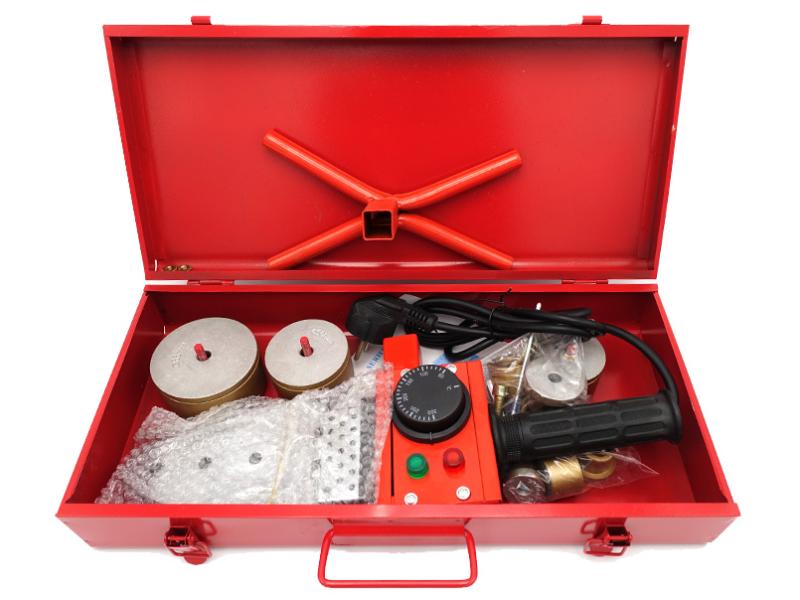 Зварювальний апарат від виробника FORA. Корпус зварювального апарату виготовлений у яскравому червоному кольорі, має зручний пластиковий перемикач для вмикання і вимикання та індикатори статусу роботи інструменту. Потужність паяльника 1000 Вт. З мережевим кабелем та вилкою. В комплект до апарату входять насадки з діаметрами 20-63 мм, що дозволяє вибирати потрібний розмір для зварювання деталей відповідних діаметрів, а також набір необхідних кріплень та тримач для інструменту. Зварювальний апарат поставляється у міцному червоному металевому кейсі з засувками, який забезпечує надійний захист інструменту під час транспортування та зберігання.