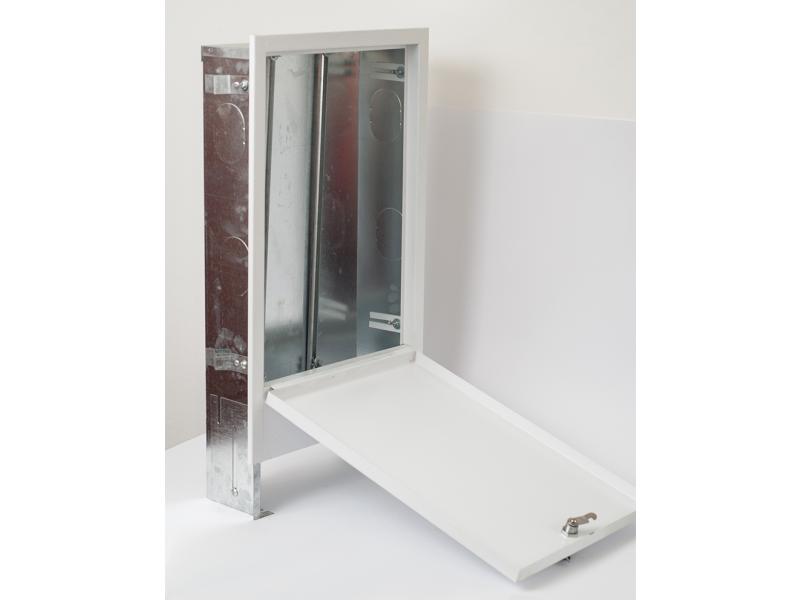 Металевий колекторний ящик білого кольору (вбудована в стіну колекторна шафа). Є моделі вбудовані, а також зовнішні. Дозволяють естетично заховати в інтер'єрі колекторні вузли. Вбудовані і пристінні колекторні шафи служать для монтажу блоків в системах опалення та гарячого водопостачання, в тому числі і типу "тепла підлога". Найчастіше всередині його встановлюється колекторний вузол з циркуляційним насосом. Також використовується ще і як маскування - в нього ховають деталі, що псують дизайн приміщення, а також уберігають гребінки від доступу до них дітей і домашніх тварин. Зазвичай на практиці розподільні короба роблять білими. Матеріал: оцинкована сталь. Фарбування проводиться порошковим барвником-емаллю після фосфатного очищення. Колір по RAL 9016. У вбудованих моделей бічні стінки не пофарбовані, і мають отвори, а також ніжки. Зовнішні - схожі на частину інтер'єру. Незалежно від підтипу, все ящики обладнані дверцятами, що закриваються на ключ (йдуть в комплекті поставки). Висота ящика 600 мм, з ніжками 700 мм. Глибина ящика: 120 мм.