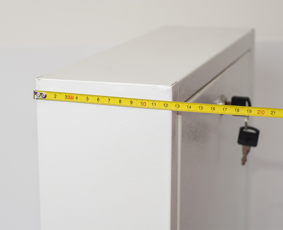 Металевий колекторний ящик білого кольору (окремо розміщена зовнішня колекторна шафа). Є моделі вбудовані, а також зовнішні. Дозволяють естетично заховати в інтер'єрі колекторні вузли. Вбудовані і пристінні колекторні шафи служать для монтажу блоків в системах опалення та гарячого водопостачання, в тому числі і типу "тепла підлога". Найчастіше всередині його встановлюється колекторний вузол з циркуляційним насосом. Також використовується ще і як маскування - в нього ховають деталі, що псують дизайн приміщення, а також уберігають гребінки від доступу до них дітей і домашніх тварин. Зазвичай на практиці розподільні короба роблять білими. Матеріал: оцинкована сталь. Фарбування проводиться порошковим барвником-емаллю після фосфатного очищення. Колір по RAL 9016. У вбудованих моделей бічні стінки не пофарбовані, і мають отвори, а також ніжки. Зовнішні - схожі на частину інтер'єру. Незалежно від підтипу, все ящики обладнані дверцятами, що закриваються на ключ (йдуть в комплекті поставки). Глибина ящика: 120 мм.