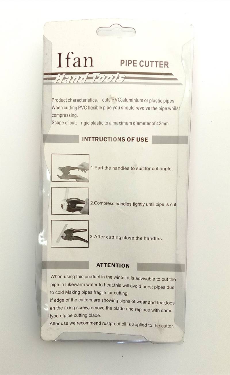 Професійні ножиці для ППР-труб IFAN, поставляються в блістері. Діапазон діаметрів труб – 16-40 мм. Інструмент підходить для різки ппр труб, алюмінієвих і пластикових труб. Країна-виробник – Китай.