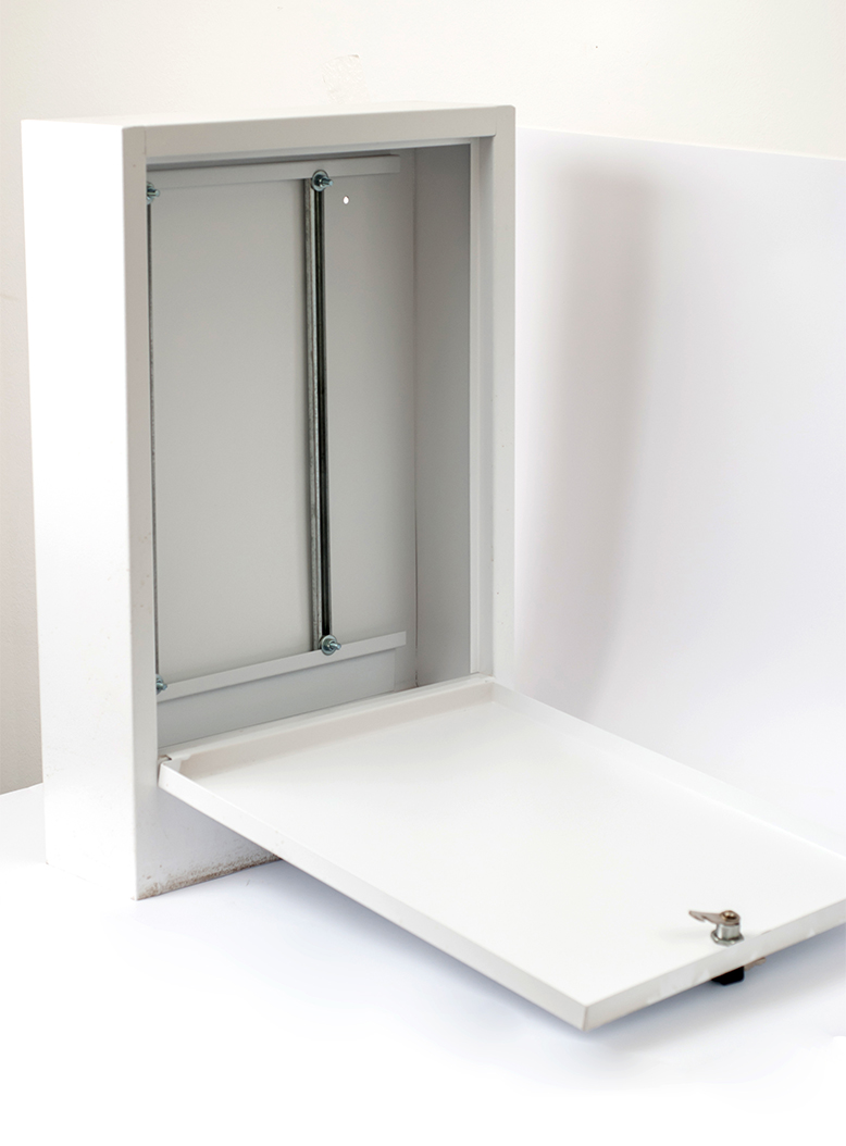 Металевий колекторний ящик білого кольору (окремо розміщена зовнішня колекторна шафа). Є моделі вбудовані, а також зовнішні. Дозволяють естетично заховати в інтер'єрі колекторні вузли. Вбудовані і пристінні колекторні шафи служать для монтажу блоків в системах опалення та гарячого водопостачання, в тому числі і типу "тепла підлога". Найчастіше всередині його встановлюється колекторний вузол з циркуляційним насосом. Також використовується ще і як маскування - в нього ховають деталі, що псують дизайн приміщення, а також уберігають гребінки від доступу до них дітей і домашніх тварин. Зазвичай на практиці розподільні короба роблять білими. Матеріал: оцинкована сталь. Фарбування проводиться порошковим барвником-емаллю після фосфатного очищення. Колір по RAL 9016. У вбудованих моделей бічні стінки не пофарбовані, і мають отвори, а також ніжки. Зовнішні - схожі на частину інтер'єру. Незалежно від підтипу, все ящики обладнані дверцятами, що закриваються на ключ (йдуть в комплекті поставки). Глибина ящика: 120 мм.
