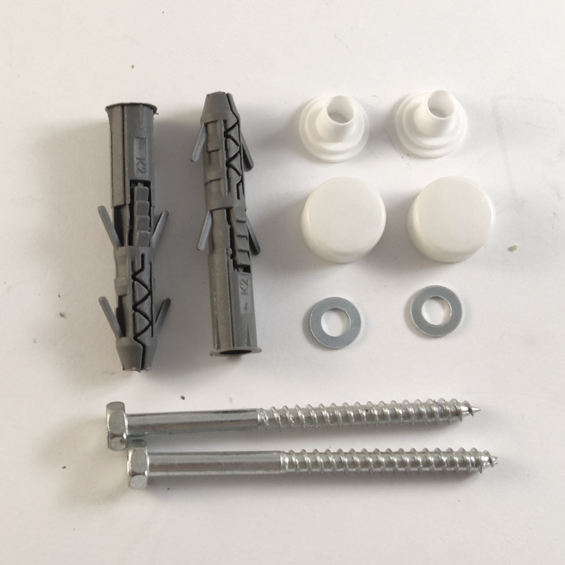 Комплект кріплень для підлогової установки унітазу і біде виробництва України. Продається в поліетиленовому пакеті з міцним картонним тримачем для підвісу. Комплектація: Шуруп з шестигранною головкою 6х80 мм нержавіюча сталь – 2 шт. Дюбель для шурупа 10х60 мм поліпропілен – 2 шт. Шайба плоска - 6х12 мм нержавіюча сталь 2 шт. Декоративні ковпачки поліпропілен – 4 шт.