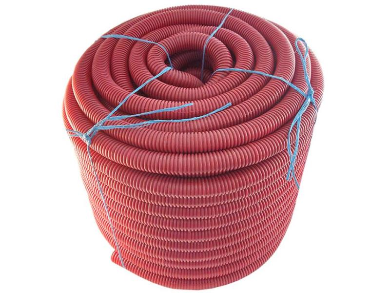 Гофрований рукав червоного кольору в бухті довжиною 50 м. Внутрішній діаметр – 18 мм, зовнішній – 22 мм. Призначений для захисту зовнішніх поверхонь водопровідних труб від механічних і хімічних пошкоджень. Матеріал – пластик. Країна – виробник – Україна.