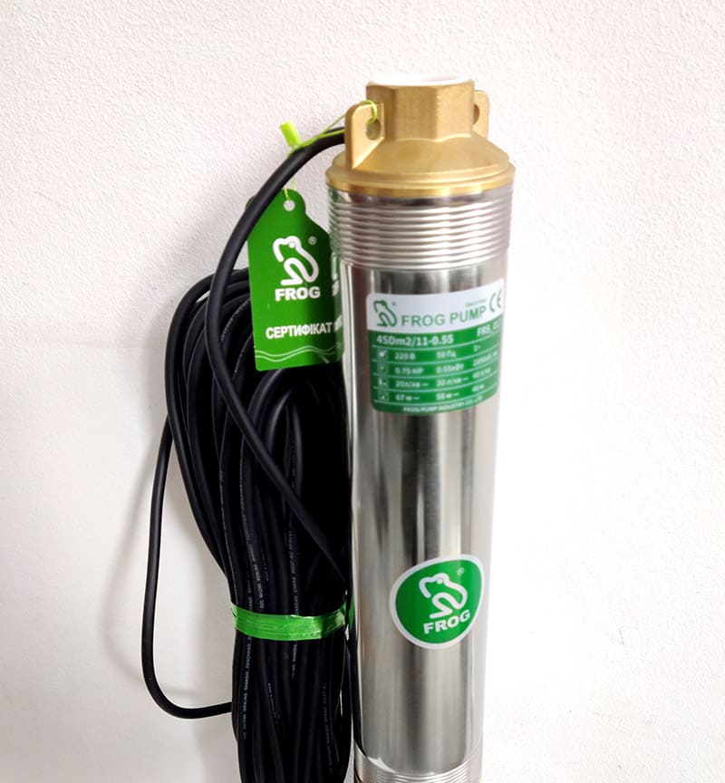 Свердловинний відцентровий насос FROG 4SDm2/19 4,2 м3/год.,126 м з кабелем 50м потужністю 1,1 кВт. Швидкознімна кабельна муфта. Сфера застосування: • Подача води з колодязя або резервуара • Подача води для сільськогосподарських цілей • Будівельний дренаж і зневоднення • Промислове охолодження, розподіл води та підвищення тиску тощо ТЕХНІЧНІ ДАНІ • Максимальна температура води: 35˚С • Максимально дозволений вміст піску: 2500 г/м3 • Маслонаповнений двигун з обмоткою • Напруга / частота: 220-240 В / 50 Гц (оснащено контрольною автоматикою) • Клас ізоляції: В • Клас захисту: IP68 МАТЕРІАЛИ: Корпус насоса: нержавіюча сталь Вхідний отвір, випускний отвір Cast-Cu (лита мідь) Фільтр AISI 304SS Механічне ущільнення: Кераміка Дифузор: PC Верхня опора: Мідь/Сталь Робочі колеса: Поліацеталь Обмотка: мідь. Випуск: 11/4'. Габариты самого насоса, мм: д1160 * ш92* в92