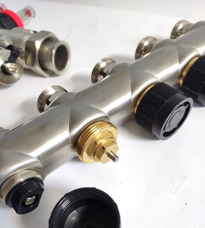 Колекторна група з нержавіючої сталі призначена для установки в системах опалення з примусовою циркуляцією. Підключення трубопроводу, що підводить до колекторної групи, можливо за вибором з лівого або правого боку. Кріплення дозволяє встановити колекторну групу в монтажній шафі або безпосередньо на стіні. Колекторна група може бути оснащена кульовим краном. Приєднання кульового крана з плоским ущільненням здійснюється безпосередньо на накидну гайку (G1 внутрішня різьба) колекторної групи. Можлива установка стандартних лічильників тепла G 1 і G 3/4. За рахунок цього будівельна глибина і ширина колекторної групи збільшуються, що слід враховувати при виборі монтажної шафи. Приєднання падаючої і зворотної лінії: зовнішня різьба G 3/4 відповідно до DIN EN 16313 (євроконус). Для позначення прямої і зворотної лінії додаються спеціальні наклейки.