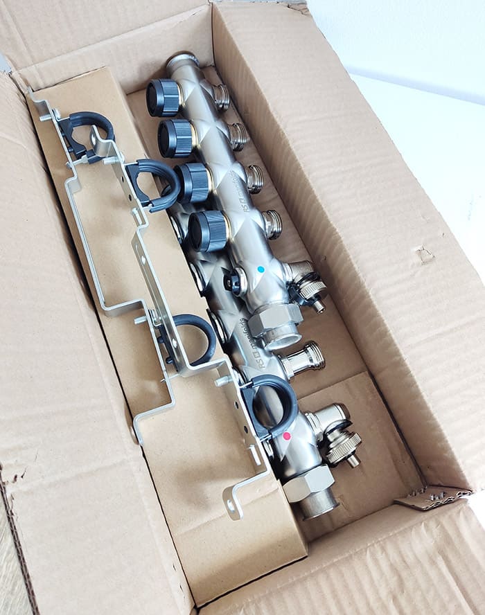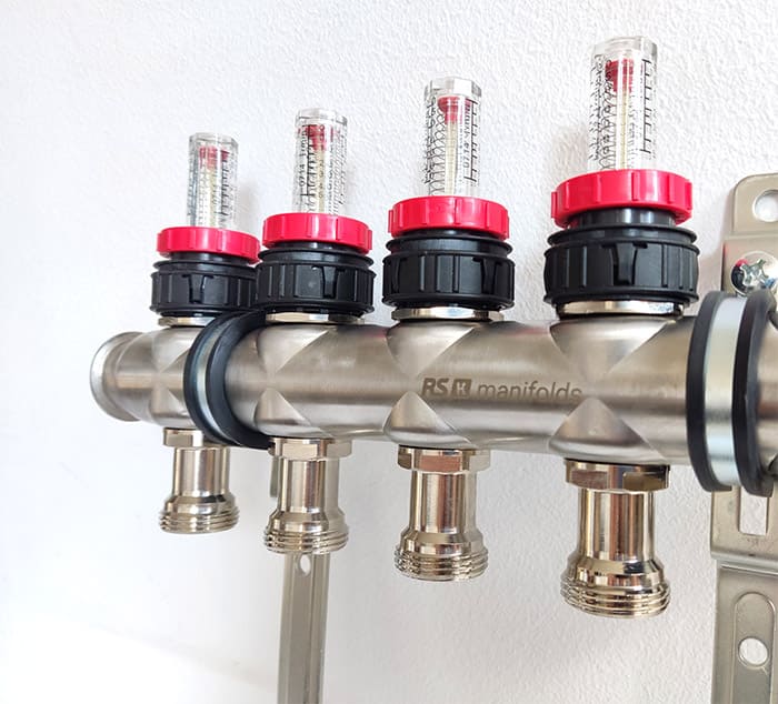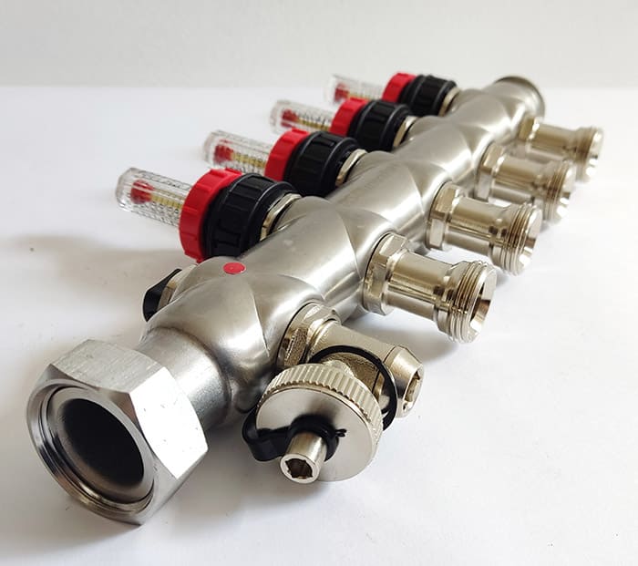 Колекторна група з нержавіючої сталі призначена для установки в системах опалення з примусовою циркуляцією. Підключення трубопроводу, що підводить до колекторної групи, можливо за вибором з лівого або правого боку. Кріплення дозволяє встановити колекторну групу в монтажній шафі або безпосередньо на стіні. Колекторна група може бути оснащена кульовим краном. Приєднання кульового крана з плоским ущільненням здійснюється безпосередньо на накидну гайку (G1 внутрішня різьба) колекторної групи. Можлива установка стандартних лічильників тепла G 1 і G 3/4. За рахунок цього будівельна глибина і ширина колекторної групи збільшуються, що слід враховувати при виборі монтажної шафи. Приєднання падаючої і зворотної лінії: зовнішня різьба G 3/4 відповідно до DIN EN 16313 (євроконус). Для позначення прямої і зворотної лінії додаються спеціальні наклейки.