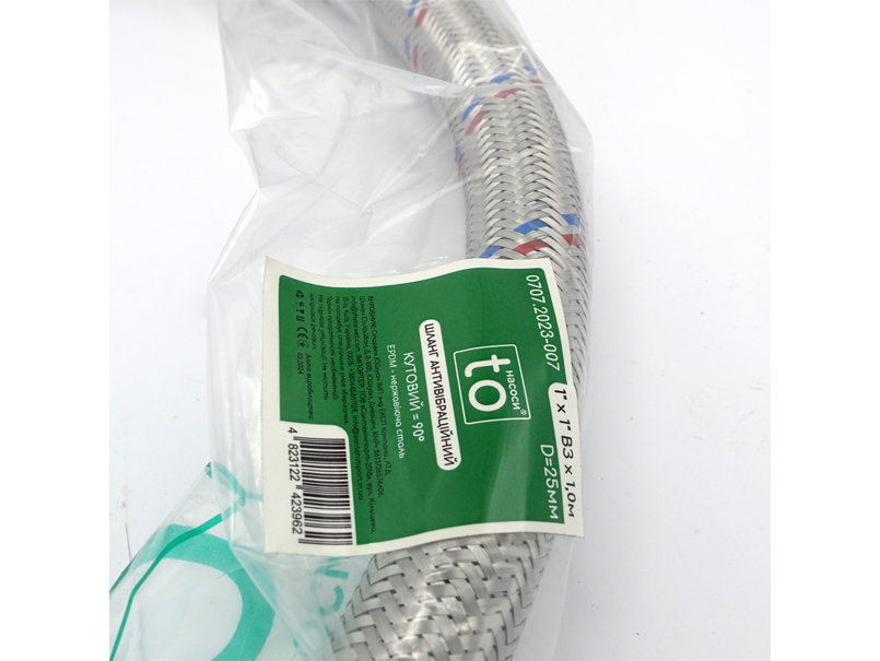 Антивібраційний кутовий шланг від виробника toНасоси - це сантехнічний виріб, призначений для створення надійного і гнучкого з'єднання між різними сантехнічними компонентами, зокрема насосами, системами водопостачання, гідроакумуляторами та іншими пристроями, які використовуються для очищення та розподілу води. Основною функцією антивібраційного кутового шлангу є зменшення передачі вібрації та ударних навантажень між підключеними компонентами, що сприяє збереженню їхньої цілісності та працездатності. Внутрішня частина шлангу виготовлена з міцної гуми, що забезпечує герметичність та відповідність стандартам для перекачування води та інших рідин, зовнішня частина має металеве обплетення, яке надає йому міцності та захищає від механічних пошкоджень. Головними складовими цього виробу є штуцер (підключається до інших пристроїв) і накидна гайка (використовується для закріплення шлангу). Діаметр шлангу 25 мм, різьбового підключення 1", довжина шлангу 1,0 м. Тип з'єднання внутрішньо-зовнішній. Змінний гнучкий шланг для побутової насосної станції поставляється у поліетиленовому пакуванні (рукав).