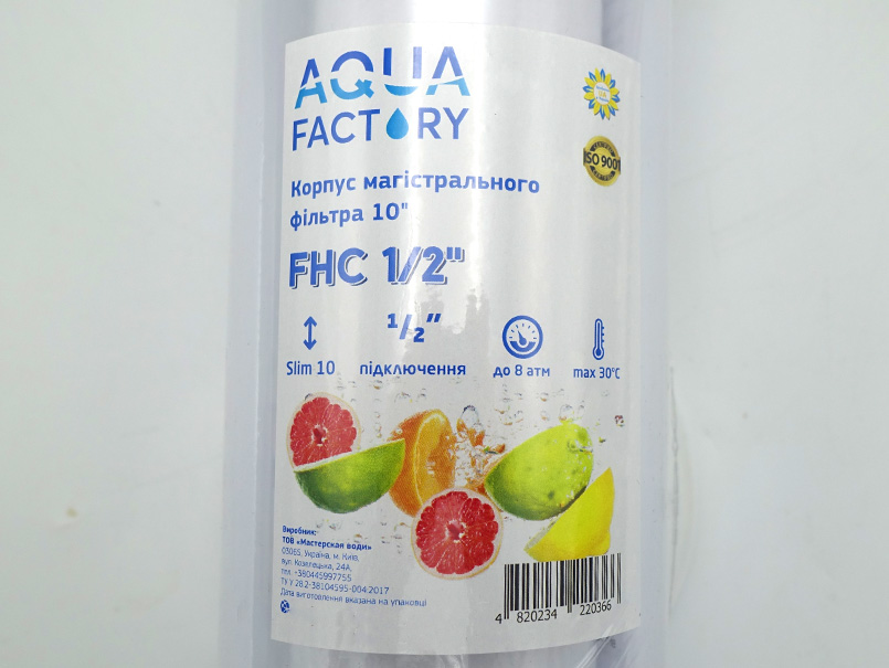 «Aqua Factory» спеціалізується на виготовленні колб для фільтрів та використовує лише безпечні та високоякісні матеріали, що відповідають сучасним стандартам. Рекомендований робочий тиск становить до 8 атмосфер, проте проведені тести показали, що корпуси можуть витримувати тиск до 30 атмосфер. Робоча температура колби від 4 до 30 градусів Цельсія. Корпус фільтру забезпечений стандартним латунним різьбленням з роз'ємом 1/2 дюйма. Готові вироби упаковуються в термоусадкову плівку. Кожен комплект включає в себе корпус, який складається з кришки і колби, ущільнюючого кільця, кронштейна, ключа і болтів. Характеристики: Максимальна робоча температура, С: 30 Габарити (ВхШхГ), мм: 315x150x150 Матеріал: пластик Вага, кг: 1 Монтаж: на магістраль Оптимальний робочий тиск, бар: 8 Колір: білий