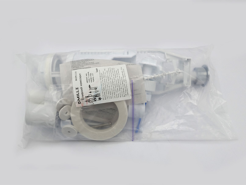 Набір для бачка унітазу MILLZ BK2R1110 складається зі зливного механізму з подвійним режимом зливу і хромованою кнопкою і наливного клапана з бічною підводкою пластиковим штуцером з різьбленням діаметром 1/2". Комплектується двома кільцями з еластичного спіненого ППУ, а також конусної і плоскою шайбами з еластичного високоякісного PVC, що забезпечують надійну герметизацію при установці клапана і механізму в бачку унітаза. Так само в комплект входить набір кріплення бачка до унітазу з гвинтами, гайками і шайбам з нержавіючої сталі. Область застосування для підключення унітазного бачка з боковим підведенням до мережі водопостачання для автоматичного наповнення унітазного бачка водою для зливу води з бачка унітазу для бачка унітазу із зливним отвором Ø60-70 мм Технічні характеристики приєднувальний розмір до мережі водопостачання G1/2" діапазон робочих тисків 0,05-1,0 Мпа час заповнення бачка в обсязі 6,0 л не більше 150 секунд стабільність рівня наповнення унітазного бачка водою не більше +/-2 мм рівень шуму при роботі не більше 50 дБА встановлений ресурс не менше 150000 циклів висота комплектного бачка з кришкою 330-400 мм діаметр приєднувального отвору в бачку унітаза 60-70 мм кількість режимів зливу - 2 обсяг зливаної води в першому (економному) режимі - 3 л середня витрата води, яка подається з бачка на змив через арматуру не менше 2,5 л/сек зусилля натискання кнопки для запуску зливу води не більше 20Н довжина нержавіючих гвинтів кріплення бачка до унітазу 82 мм Властивості комплектується ущільнювальними конусної і плоскою шайбами для герметизації з'єднання наливного клапана з бачком унітазу конусна і плоска шайби виготовлені з еластичного високоякісного PVC комплектується двома кільцями з еластичного спіненого ППУ, що забезпечують надійну герметизацію при установці зливного механізму в бачок унітаза, а так само при установці бачка унітазу на поличку унітаза штуцер різьбовий з високоякісного пластика в комплект входить набір кріплення бачка до унітазу гвинти, гайки і шайби для кріплення бачка до унітазу виготовлені з нержавіючої сталі кнопка і декоративне кільце кнопки пластмасові з хромованим покриттям робочий діапазон температур від 0 до + 95° C