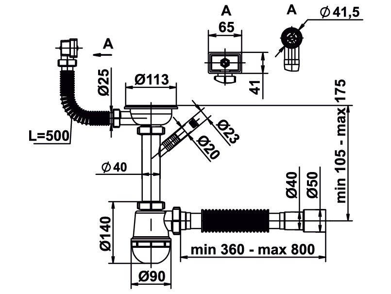 Сифон мийка 3 1/2"х40 різьб.випуск, відвід пр.маш, гофротруба 40х40/50 круглий перелив MILLZ 1/30