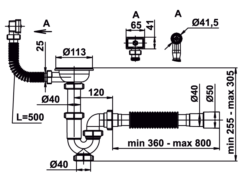 Сифон мийка 3 1/2"х40 різьб.випуск.,ПРЯМОТОЧН., ревізія, гофротруб. 40х40/50 круглий перелив MILLZ