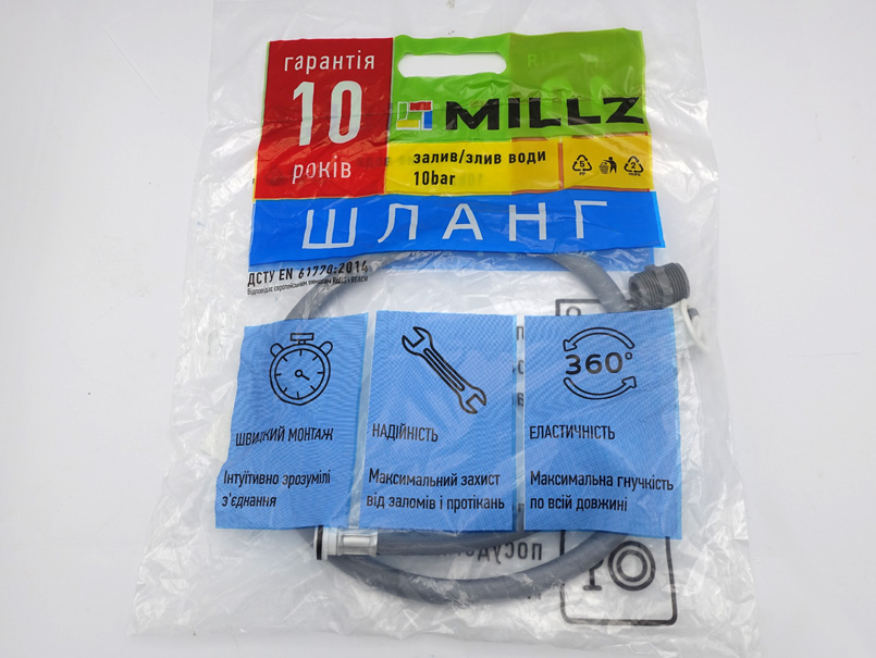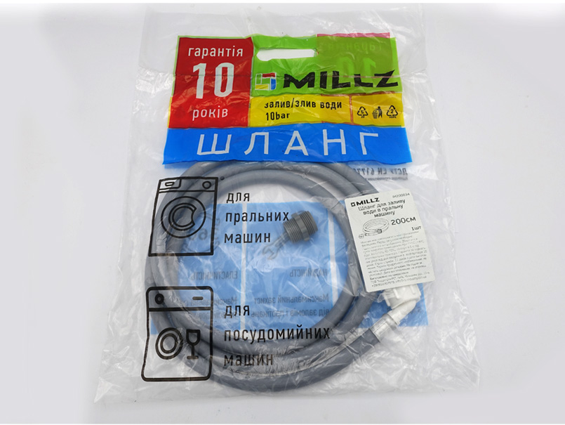 MILLZ - якісні шланги для заливу та зливу води для пральних машин, розроблений спеціально для українських споживачів. Порадує покупця приємною ціною і високою надійністю. Шланг призначено для підключення пральної або посудомийної машини до каналізації. Довжина шланга від 1 до 4 метрів (зазначена в назві товару). Комплектуєтся пластмасовим з'єднувальним штуцером типу "ялинка" для шланга 1/2"-3/4 " (зля зливного шланга) або гайками (для заливного). Застосовуються дані шланги для підключення пральної або посудомийної машини до каналізації.