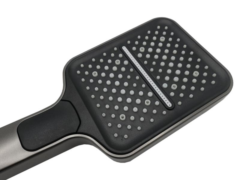 Душова лійка практичного графітового кольору має оригінальний дизайн. Корпус із матовим дзеркальним покриттям підкреслює робочу поверхню, на якій рівномірно розташовані світлі форсунки. Вони мають різні за розміром виходи, що забезпечує три режими подачі води. Вибрати один із них можна за допомогою кнопки-перемикача. Робоча поверхня лійки має правильну прямокутну форму з плавними округленими краями (10,5 х 12, 5 х 2,3 см). Утримувач (12 см) легко лягає в руку. Прикріплюється до шланга. Продається в міцній картонній коробці розміром 30 х 12 х 5,5 см. На упаковці є штрихкод. Додатково упакована в пупирчасту плівку, різьба захищена пластиковою заглушкою, що не допускає отримання подряпин під час транспортування. Гарантія — 2 роки. Країна-виробник — Китай.