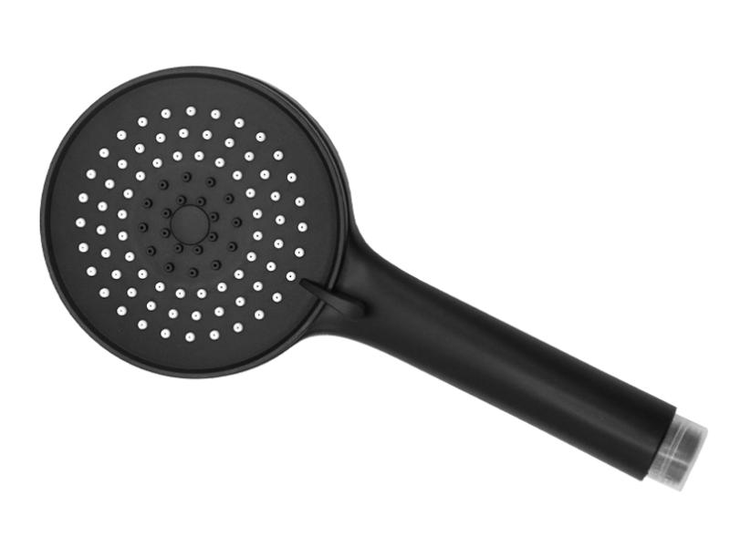Душова ручна лійка зі зносостійкого та безпечного пластику підійде тим, хто цінує економічність та функціональність. Чорні та білі форсунки різного діаметру створюють три режими подачі води. Вибрати будь-який із них можна за допомогою поворотного диска. Робочу поверхню можна використовувати і як масажну щітку — такий ефект забезпечують опуклі форми форсунок. Лійку діаметром 11 см можна приєднати до стандартного шланга. Постачається в прозорому силіконовому пакеті розміром 36 х 14 см. На упаковці є штрихкод. Різьба додатково захищена пластиковою заглушкою, що не допускає появи подряпин під час транспортування. Гарантія — 1 рік. Країна-виробник — Китай.