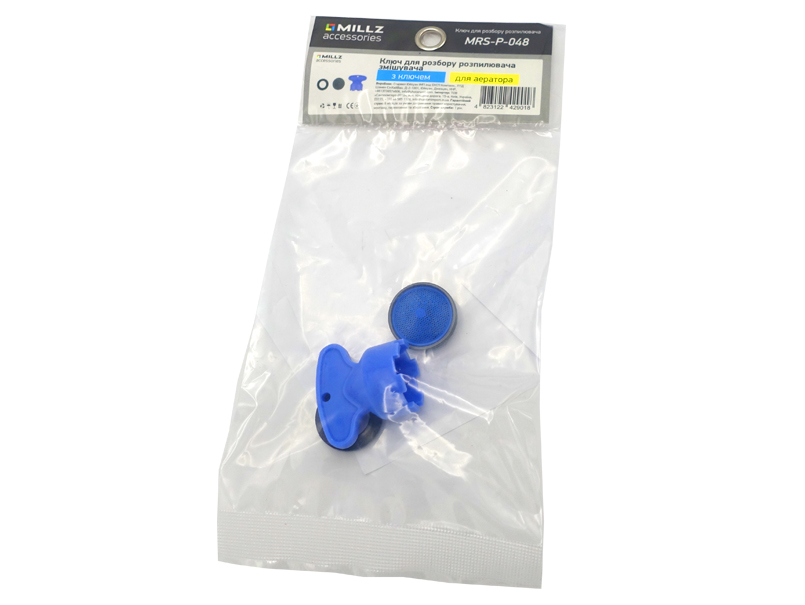 Набір для розбору аератора MILLZ MRS-P-048 – це зручне рішення для очищення та заміни аераторів. Він виготовлений із міцного пластику, що гарантує довговічність. Ключ має яскравий синій колір, центральна частина аератора також синя, окантовка – сіра, а прокладка – чорна. Завдяки продуманій конструкції він дозволяє легко розібрати аератор, швидко очистити його від вапняного нальоту та інших забруднень або просто замінити. Установлюється у вилив, що робить процес ще зручнішим. У комплект входять ключ, аератор і прокладка. Усе акуратно запаковане в прозорий поліетилен із отвором для підвісу на вітрину та штрих-кодом. На товар поширюється гарантія 6 місяців.