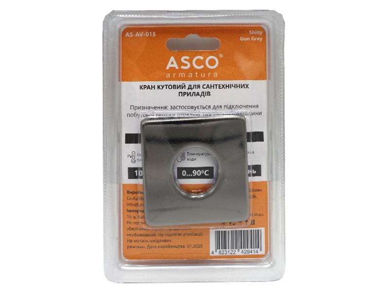 Кутовий кран ASCO використовують для підключення сантехнічних приладів, таких як пральні й посудомийні машини, до системи водопостачання за допомогою гнучких шлангів з накидною гайкою. Кран відрізняється міцністю та довговічністю: він виготовлений з латуні та має блискуче сіре покриття, що захищає його від появи подряпин. Витримує тиск до 10 бар та температуру від 0°C до +90°C. Завдяки цьому може бути використаний в умовах інтенсивної експлуатації та розрахований мінімум на 3000 циклів. Кран має компактну форму (7х3,5 см), що дозволяє його встановити в обмеженому просторі, та два виходи із зовнішньою різьбою (1/2"х1/2"). Монтується як вертикально, так і горизонтально. Гарантійний термін — 1 рік. Виробництво — Китай.